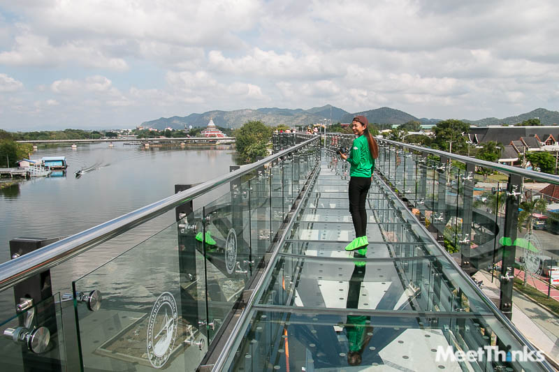 ใครที่กลัวความสูงเหมาะมากสำหรับการมาเยือนสกายวอล์กเมืองกาญ เพราะเป็นสะพานลอยฟ้าที่ไม่สูงมากนัก ตั้งอยู่ในทำเลเลียบแม่น้ำ  ตัวโครงสร้างและทางเดินกระจกนิรภัยรู้สึกได้ถึงความแข็งแกร่ง ไม่ได้โล่งโปร่งแบบมองลงไปแล้วใจหาย แต่ถ้ายังกลัวก็แนะนำง่าย ๆ ว่าอย่ามองลงไปด้านล่าง มีมือคนข้าง ๆ ก็ให้จับไว้ เดินคนเดียวก็เกาะราวสะพานไป  ทอดสายตาอันยาวไกล  จะเห็นวิวสวย ๆ โปร่งโล่งสบาย