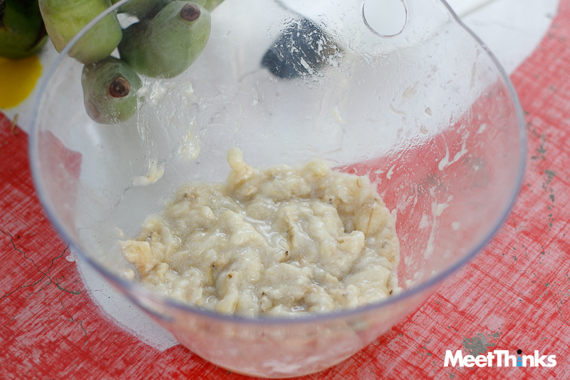 เมื่อได้กล้วยดิบสด ๆ มาแล้วก็ปอกเปลือกเขียว ๆ ออกไป หั่นเป็นชิ้นพอคำ นำไปต้มเพื่อใช้แกงเนื้อกับพริกแกงสูตรของทางร้าน เติมกระชาย ใบมะกรูด เพิ่มความหอม