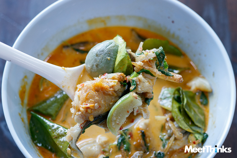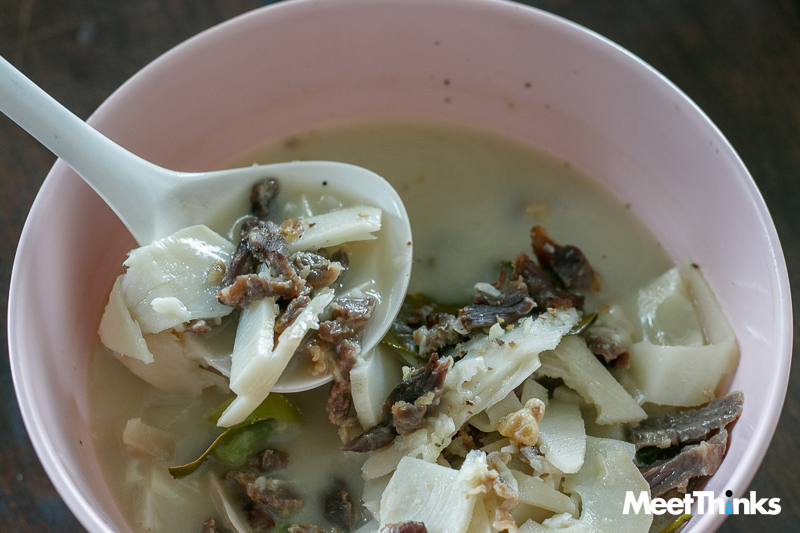 สวยกันพอหอมปากหอมคอแล้วไปต่อที่โต๊ะอาหาร ได้พบกับอีกเมนูที่มีความน่าสนใจ เป็นเอกลักษณ์ของที่นี่คือ “แกงขาว” วันนี้เชฟปรุงเมนูนี้เสิร์ฟเป็นมื้อเที่ยง ย้ำว่าเป็นเมนูแกงเผ็ด ไม่ใช่แกงจืดอย่างหน้าตาที่เห็น โดยจะไม่ใช้พริกแกง แต่ใส่กระเทียมพริกไทยโขลกลงไปให้มีความเผ็ดร้อน ใช้เนื้อแดดเดียว แกงกับหน่อไม้ดอง เป็นอีกรสชาติที่เปิดประสบการณ์ใหม่ ๆ ให้กับทุกคน