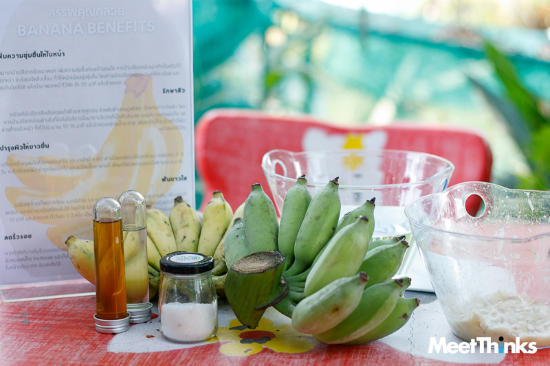 เชฟลีสาธิตการทำสปาผิวด้วยกล้วยให้ได้ชม โดยการนำกล้วยสุกบด มาผสมกับน้ำตาล น้ำผึ้ง และน้ำมันมะพร้าวเล็กน้อย ใช้สครับผิวให้ขาวนวลขึ้น เป็นอีกกิจกรรมท่องเที่ยวที่นำเสนอวัตถุดิบท้องถิ่นให้เกิดมิติที่หลากหลาย นอกจากมาเดินสายมูตามวัดต่าง ๆ แล้ว ก็แวะมากินข้าว เรียนรู้วิถีชุมชนไปด้วยกัน