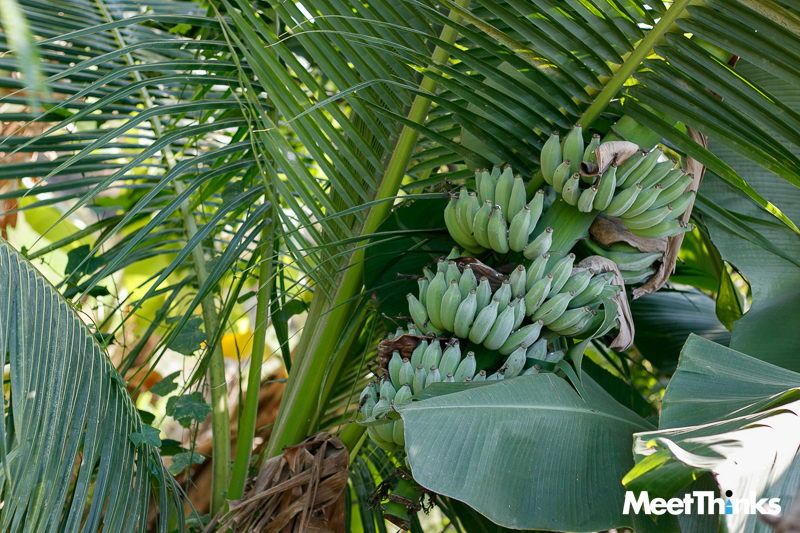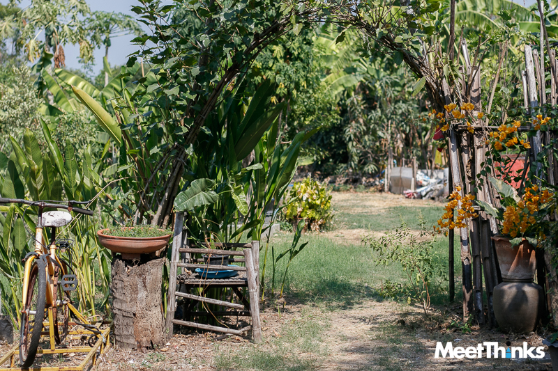 ทันทีที่มาถึง เจ้าบ้านก็พาเราเข้าสวน ไปตัดกล้วยดิบมามาทำอาหาร เมนูสาธิตวันนี้คือ “แกงกะทิเนื้อใส่กล้วย” หากจะลงลึกถึงรสชาติบ้าน ๆ จริง ๆ เชฟเมย์แนะนำ “แกงกะทิปลาไหลใส่กล้วย” หรือจะใส่ปลาดุก ปลาช่อนก็ได้