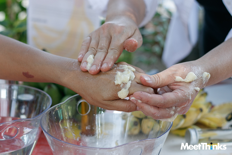 เชฟลีสาธิตการทำสปาผิวด้วยกล้วยให้ได้ชม โดยการนำกล้วยสุกบด มาผสมกับน้ำตาล น้ำผึ้ง และน้ำมันมะพร้าวเล็กน้อย ใช้สครับผิวให้ขาวนวลขึ้น เป็นอีกกิจกรรมท่องเที่ยวที่นำเสนอวัตถุดิบท้องถิ่นให้เกิดมิติที่หลากหลาย นอกจากมาเดินสายมูตามวัดต่าง ๆ แล้ว ก็แวะมากินข้าว เรียนรู้วิถีชุมชนไปด้วยกัน