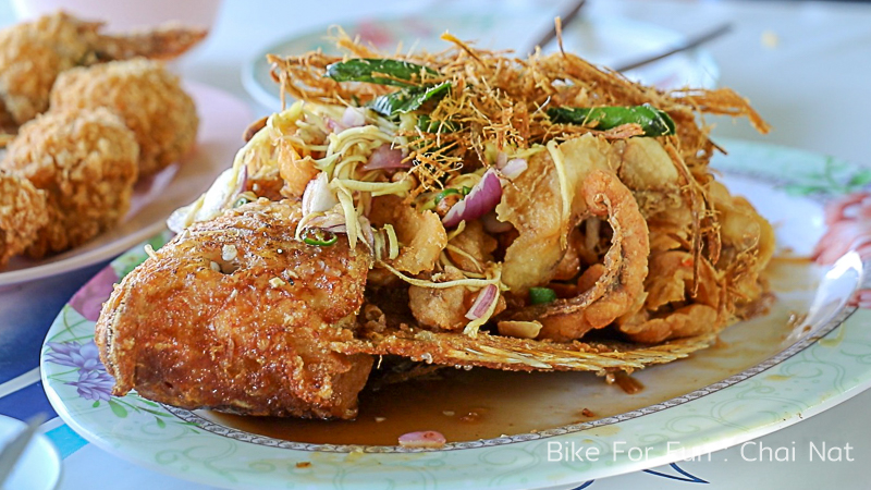 จาก อ.หนองมะโมง มีมุ่งหน้าต่อสู่ อ.วัดสิงห์ ผ่าน อ.หันคา ถึงเวลาเติมพลังมื้อเที่ยงที่ “ร้านปูท่าโบสถ์” ร้านอาหารในบรรยากาศธรรมชาติริมบึงน้ำ โดดเด่นด้วยปลาแม่น้ำหลากหลายเมนู เป็นอีกมื้อที่เต็มไปด้วยความชื่นมื่น หลังจากปั่นสนุกกันมาแล้วครึ่งวัน