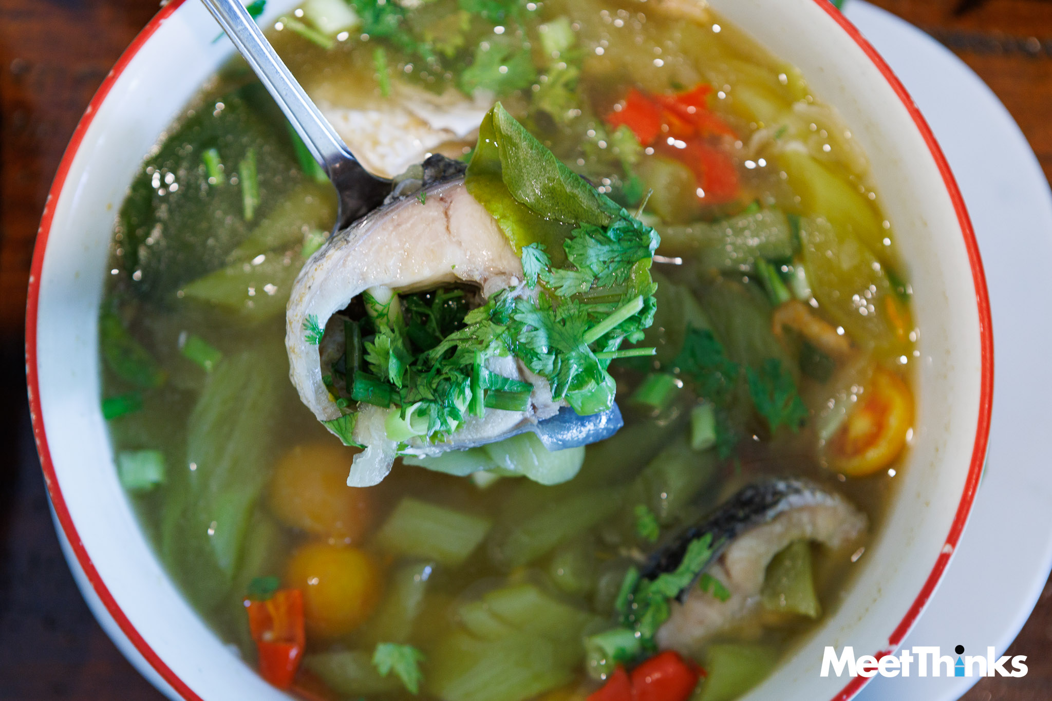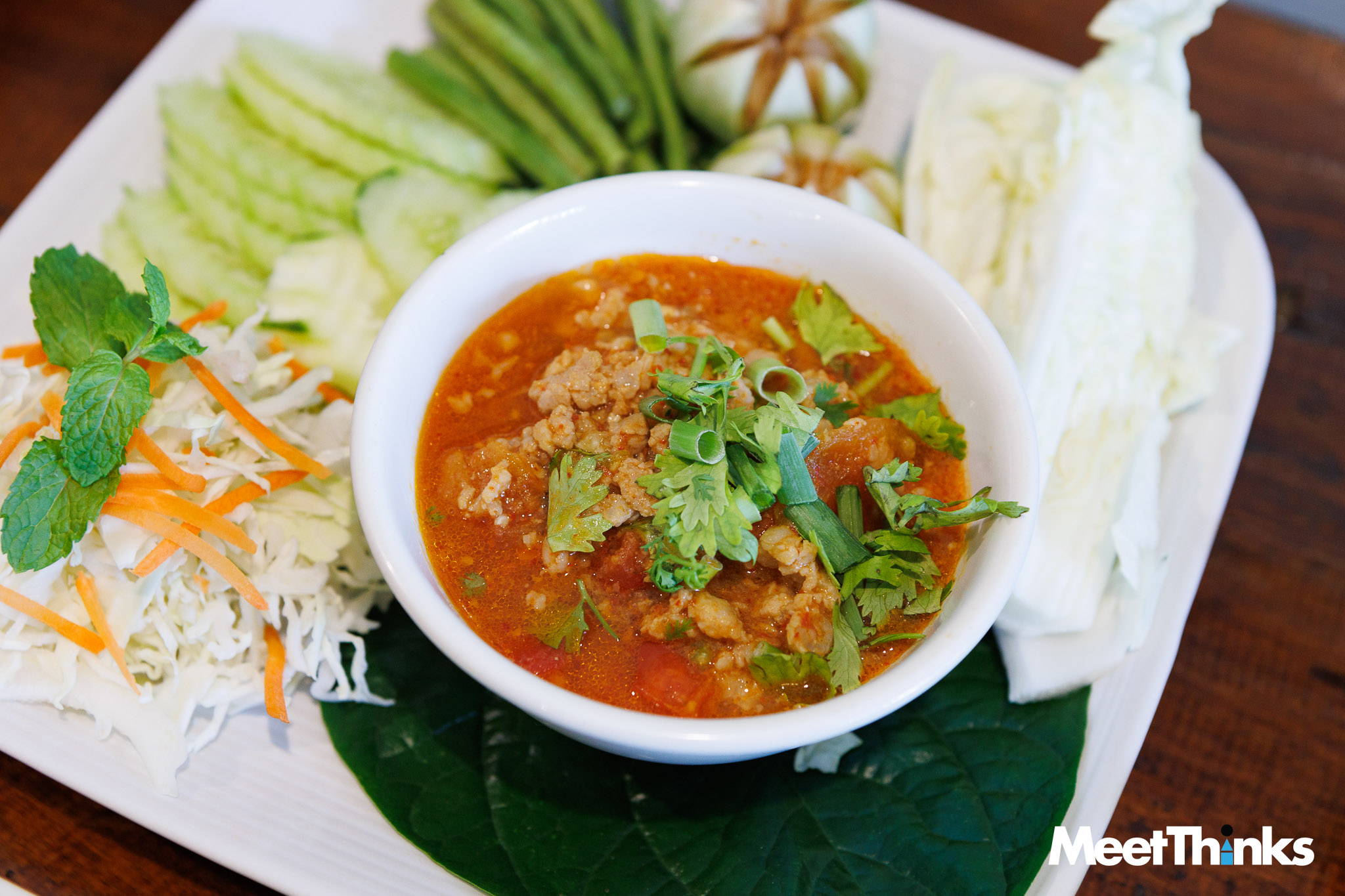 ในร้านยังมีเสิร์ฟอาหารอีกหลากหลายรายการ ภายใต้บรรยากาศร่มรื่น มองเห็นวิวภูเขา วันนี้ได้ลองเมนูเด็ดจากวัตถุดิบท้องถิ่นอย่าง “แกงตูน” ซึ่งมีลักษณะของปลาต้มกับคูนและเครื่องสมุนไพรหอม ๆ “ตูน” หรือ “คูน” เป็นพืชตระกูลบอนที่กินได้ ปลูกง่ายตามบ้านเรือนทั่วไป เมนูนี้รสชาติเบา ๆ กลมกล่อม ได้สัมผัสหนุบหนับจากคูน นอกจากนั้นยังมีเมนูเมี่ยงปลาสมุนไพร ไข่ตุ๋นหม้อไฟ น้ำพริกอ่อง ฯลฯ