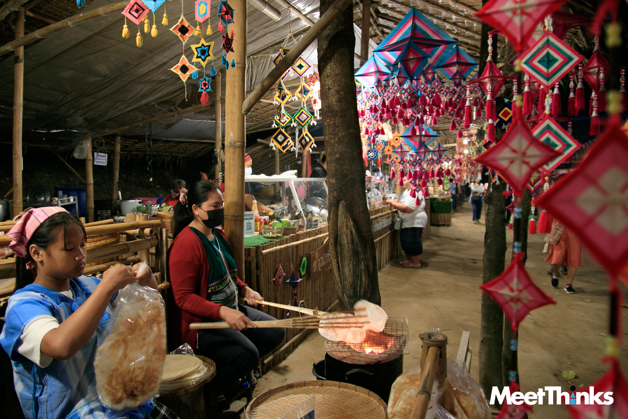 ในโซนอาหาร แต่ละร้านจะขายอาหารไม่ซ้ำกัน และจะเน้นของกินพื้นถิ่นแบบชาวกะเหรี่ยง อาทิ “ขนมจีนน้ำยาหยวกกล้วย” ที่บอกว่า ขะนอง อุ๊ย อุ๊ย หรือ อร่อยมาก ๆ “ข้าวแดกงา” ภาษากะเหรี่ยงเรียกว่า “หมี่สิ” ที่ทำมาจากข้าวเหนียวนึ่งสุก ตำกับงาดำ กินกับน้ำผึ้ง “ข้าวห่อกะเหรี่ยง” หรือ “หมี่ถ่อง” ที่เป็นข้าวเหนียวนึ่งห่อด้วยใบตอง ฯลฯ