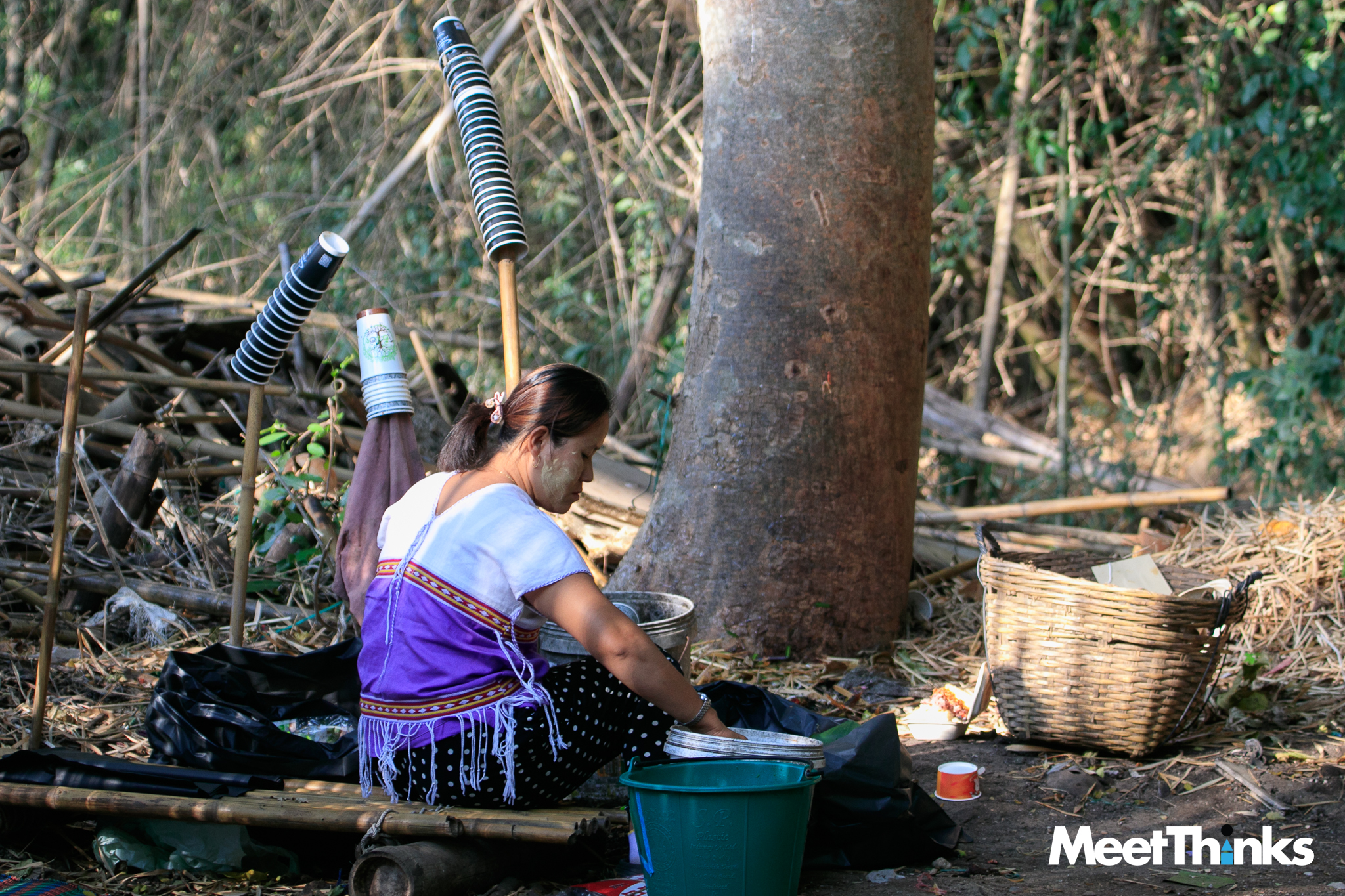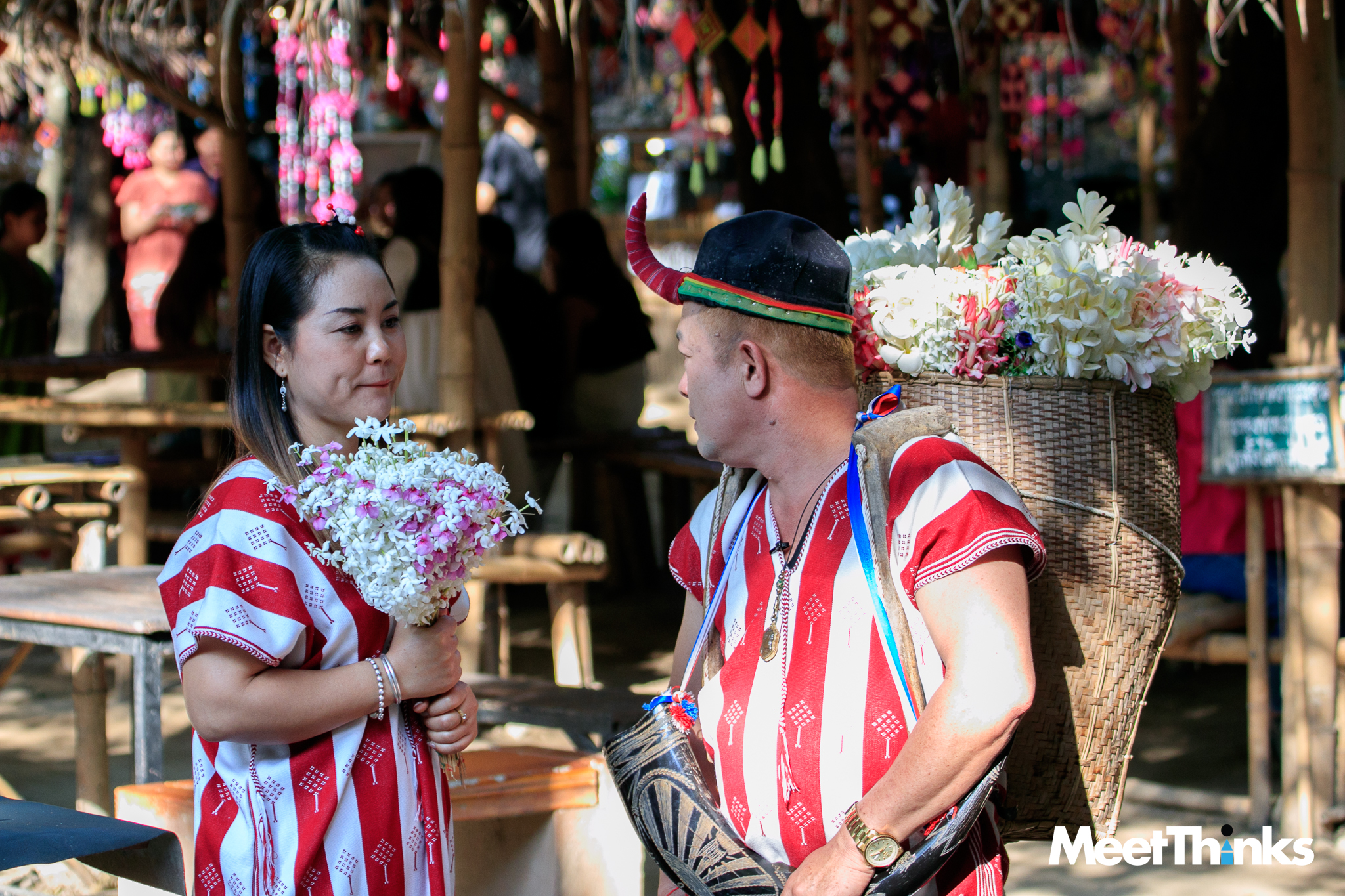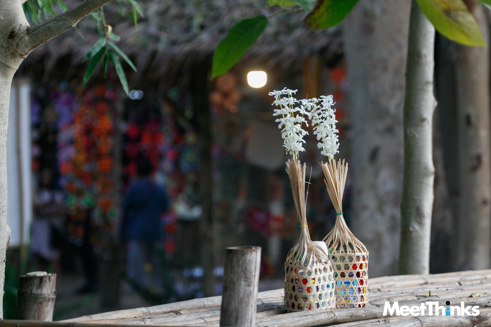 6.15 น. เราเดินทางมาถึง “ตลาดโอ๊ะป่อย” แสงจากดวงไฟน้อย ๆ ยังทำงานท่ามกลางความสลัว แต่ก็เต็มไปด้วยสีสันของสิ่งที่เราคิดว่ามันคือ “ตุง” แบบทางเหนือ ซึ่งจริง ๆ มันเรียกว่า “คังด้ง” ในภาษากระเหรี่ยง แปลว่า “ใยแมงมุม” ที่ชาวบ้านเชื่อว่าจะเป็นสิ่งที่ปกป้องคุ้มครองจากสิ่งชั่วร้าย ในตลาดจึงมีคังด้งเต็มไปหมด มิน่าล่ะ แรกเห็นก็รู้สึกดีมาก ๆ เลย