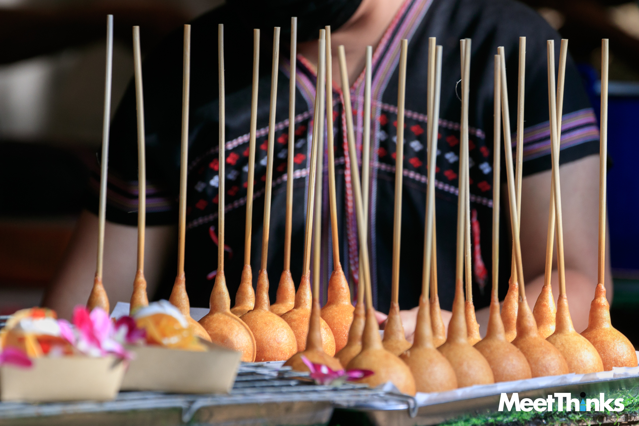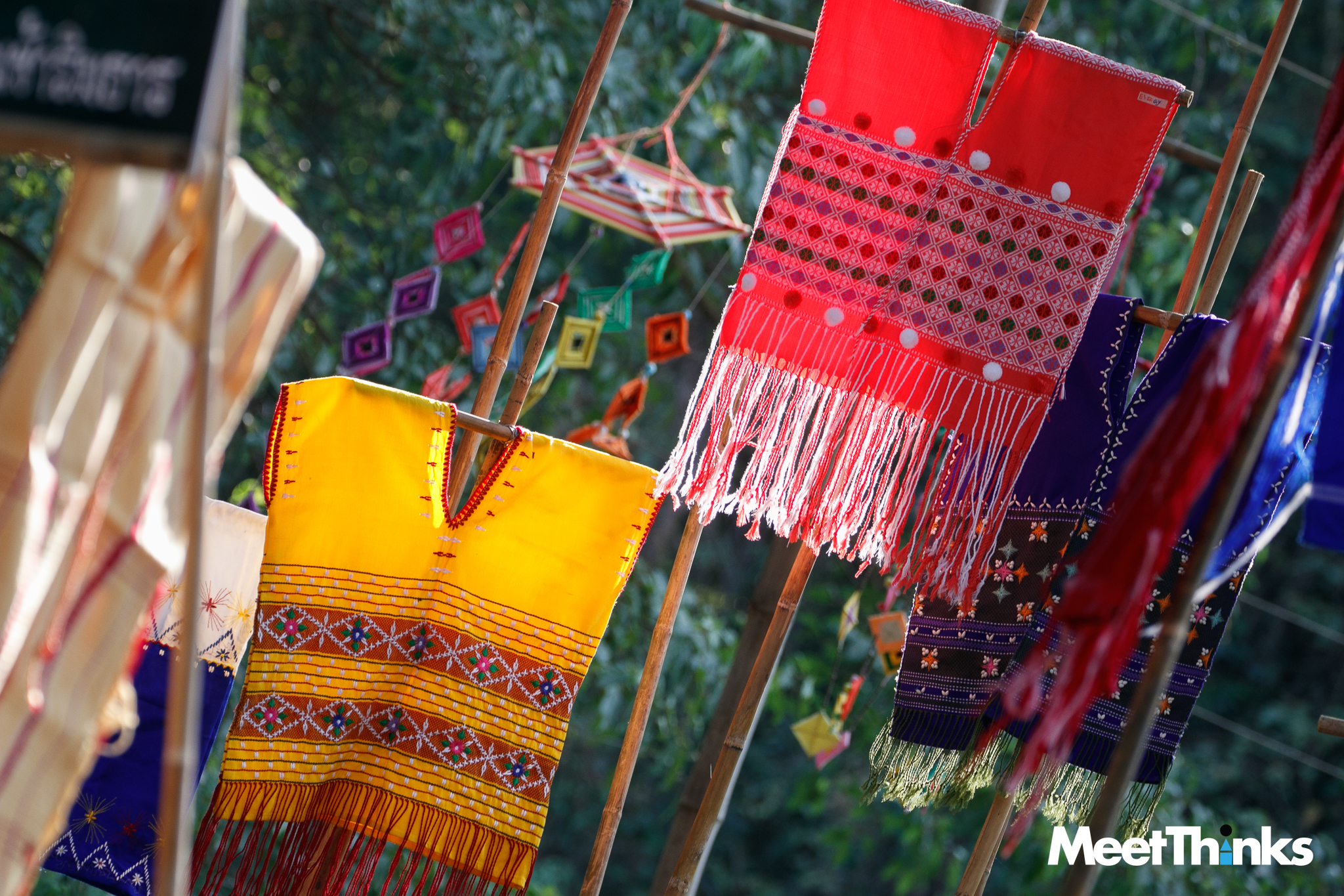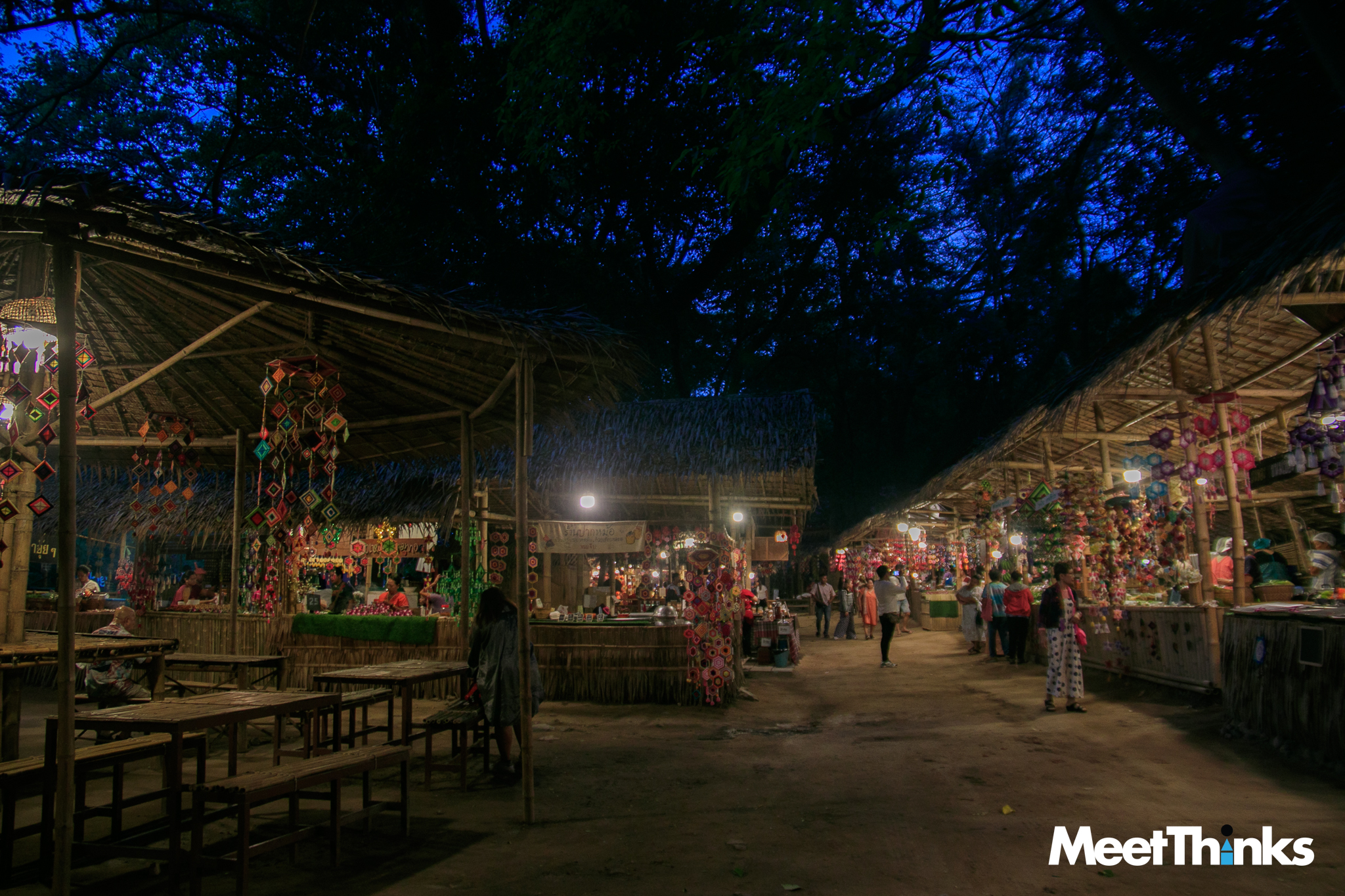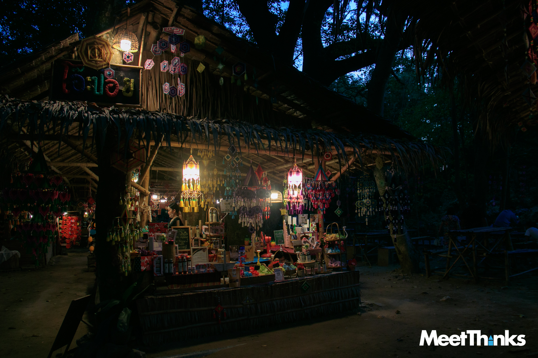 6.15 น. เราเดินทางมาถึง “ตลาดโอ๊ะป่อย” แสงจากดวงไฟน้อย ๆ ยังทำงานท่ามกลางความสลัว แต่ก็เต็มไปด้วยสีสันของสิ่งที่เราคิดว่ามันคือ “ตุง” แบบทางเหนือ ซึ่งจริง ๆ มันเรียกว่า “คังด้ง” ในภาษากระเหรี่ยง แปลว่า “ใยแมงมุม” ที่ชาวบ้านเชื่อว่าจะเป็นสิ่งที่ปกป้องคุ้มครองจากสิ่งชั่วร้าย ในตลาดจึงมีคังด้งเต็มไปหมด มิน่าล่ะ แรกเห็นก็รู้สึกดีมาก ๆ เลย
