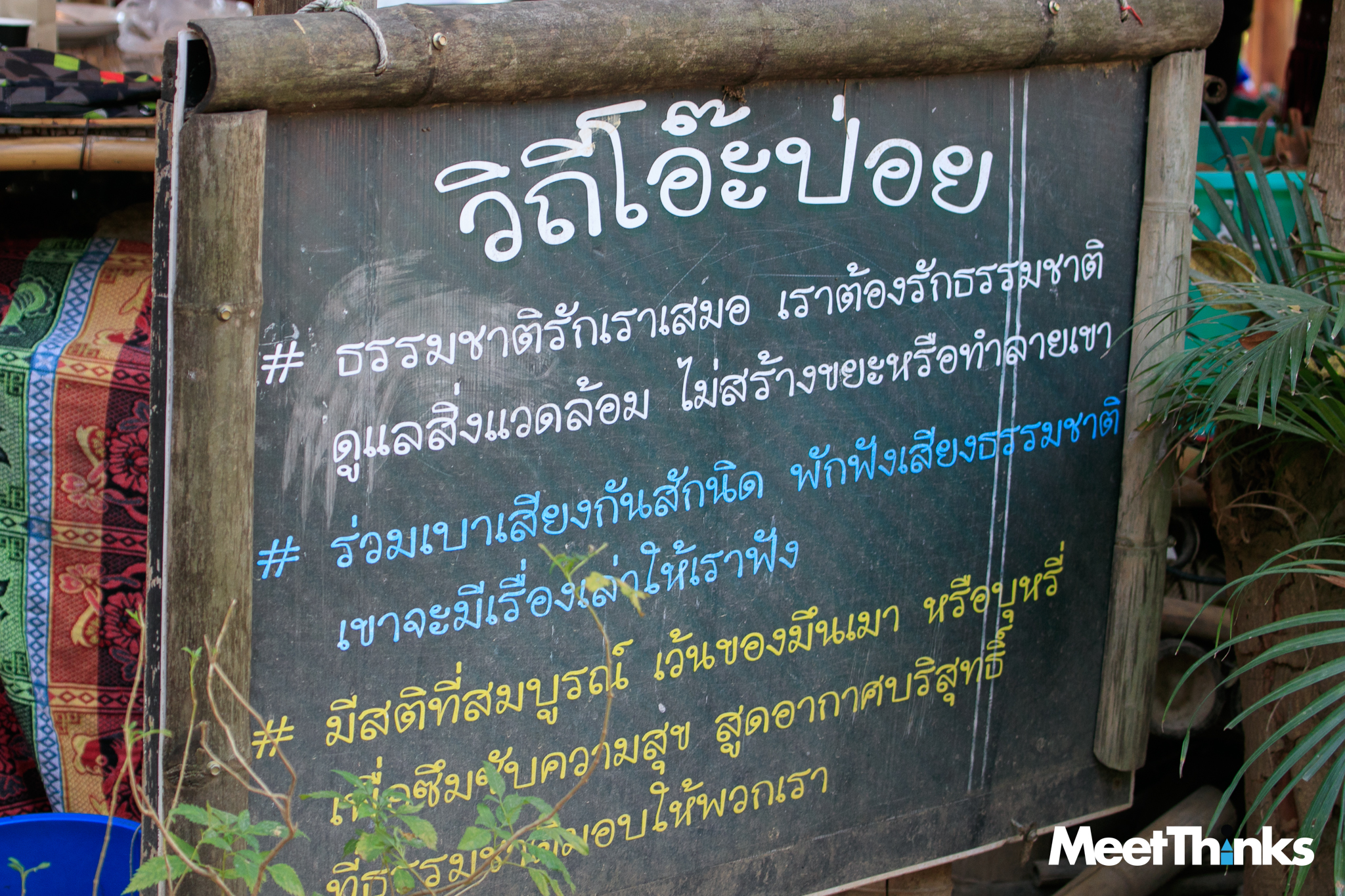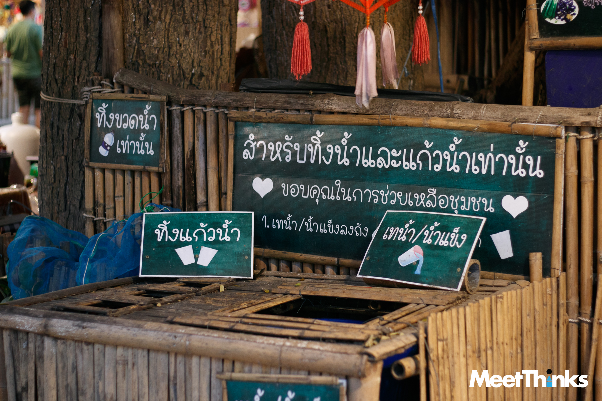 ที่น่ารักสุด ๆ คือแนวคิดที่คำนึงถึงสิ่งแวดล้อม แนว Zero Waste เพราะเมื่อเป็นตลาด ย่อมมีการกินการใช้ในปริมาณสูง ภาชนะของที่นี่ส่วนใหญ่จึงเน้นใช้วัสดุที่ย่อยสลายได้ตามธรรมชาติ ไม่มีพลาสติก ไม่มีโฟมอย่างเด็ดขาด ตามจุดต่าง ๆ จะมีจุดคัดแยกขยะ ส่วนขยะที่เด็ก ๆ เก็บไปก็จะมีเจ้าหน้าที่คัดแยกอยู่ท้ายตลาด