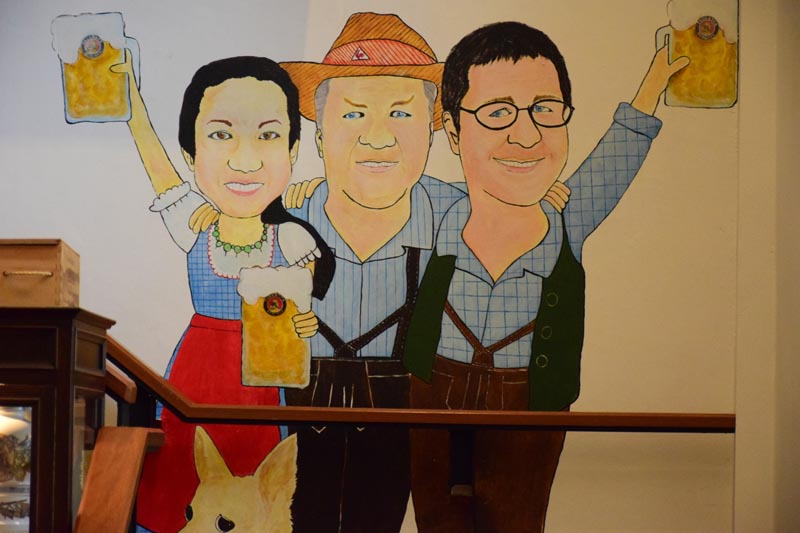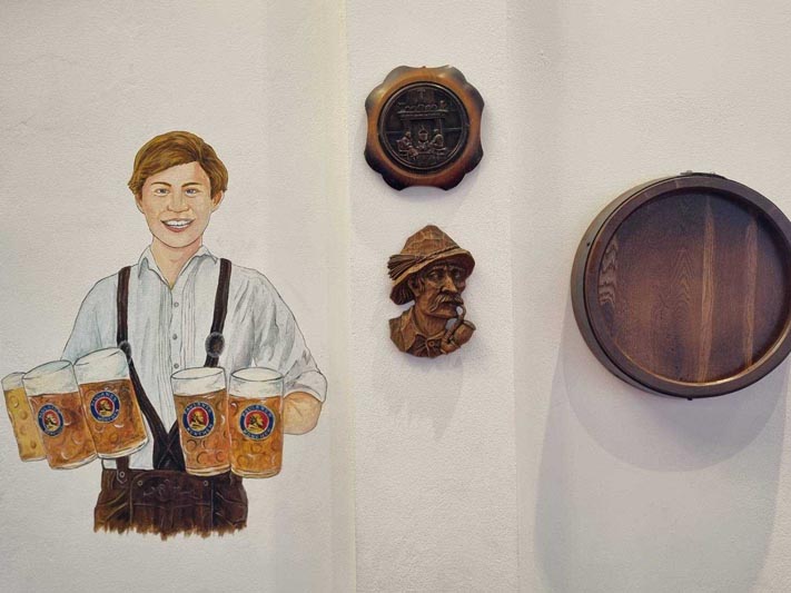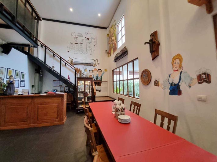 ส่วนโดยรอบตัวร้านซึ่งเป็นบ้านสไตล์โมเดิร์น  มีที่นั่งรับประทานอาหารในสวนให้ความร่มรื่นชื่นใจ  ด้านในมีการจัดวางโต๊ะอาหารตามโซนต่าง ๆ ทั้ง 2 ชั้น ให้บริการได้ถึง 80 ที่นั่ง พร้อมกับการเพลิดเพลินไปกับภาพบนผนังที่สื่อเรื่องราวกระบวนการผลิตเบียร์ สีสันงานเทศกาลเฉลิมฉลองของชาวบาวาเรียน หรือเทศกาลงานเลี้ยงในชื่อต่าง ๆ เช่น BIER CARTEN บ่งบอกบรรยากาศในหมู่บ้านของชาวบาวาเรียนที่อบอวลไปด้วยความสุข โดยเฉพาะชุมชนหรือหมู่บ้านในเมืองมิวนิก ซึ่งจะมีการจัดเทศกาลเบียร์กันทุกหมู่บ้าน โดยจะมีการจัดใหญ่ระดับประเทศเยอรมันจะใช้ชื่อว่า “อ็อกโทเบอร์เฟส” เทศกาลอันสนุกสนานที่หลายคนอยากไปเยือนสักครั้ง