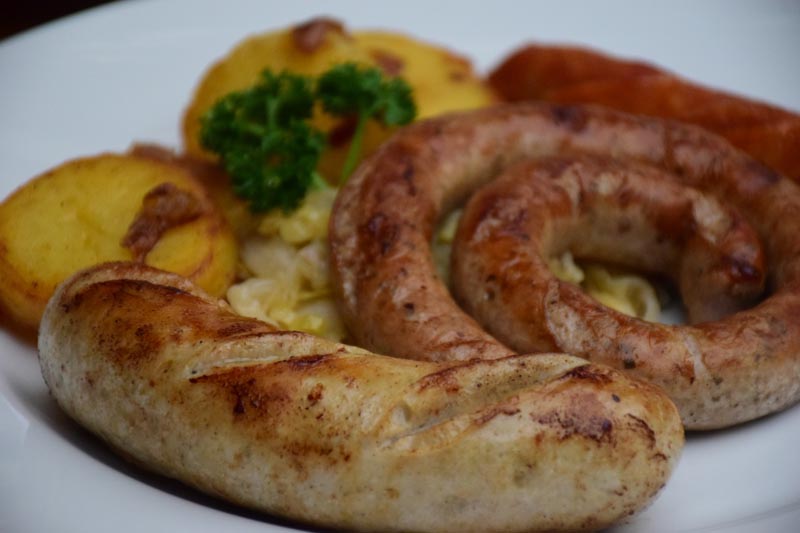 มาถึงเมนูต้นตำหรับ “ไส้กรอกบาวาเรียน” เสิร์ฟมาพร้อมกับมันฝรั่งผัดเบคอนและซาวเคราท์ (กะหล่ำปลีเปรี้ยว) ซึ่งภายในจานจะมีไส้กรอก 3 ชนิด ประกอบด้วย ทูริงเจอร์ เป็นไส้กรอกที่ม้วนกลมเด่นชัดด้วยความหอมของเครื่องเทศ ไส้กรอกชีส และ เยอรมันบราทเวิร์ส (ไส้กรอกหมูรสเยี่ยม) เป็นไส้กรอกสไตล์โฮมเมดที่ทางร้านสั่งทำเฉพาะที่นี่ โดยได้คิดค้นสูตรไส้กรอกตั้งแต่เริ่มเปิดร้าน ใช้เวลาลองผิดลองถูกอยู่ระยะหนึ่ง จนได้รสชาติที่อัดแน่นไปด้วยสมุนไพรเยอรมันนานาชนิด  เนื้อนุ่มมากเป็นพิเศษ อีกเคล็ดลับคือ ก่อนเสิร์ฟทางร้านจะนำไส้กรอกไปต้มเสียก่อนเพื่อรีดไขมันออกแล้วนำไปย่าง ได้เนื้อสัมผัสที่คงความนุ่ม หอม กินแล้วไม่เลี่ยน