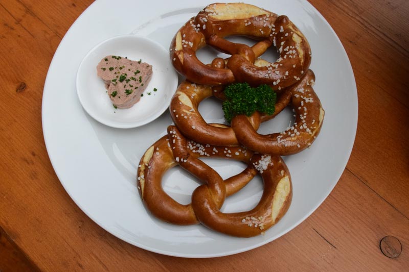 เพลินใจเพลินตา แล้วมาเพลินสัมผัสรสชาติ เริ่มต้นจาก “ขนมปังเพรทเซล” รูปเลข 8 สไตล์เยอรมัน ที่ส่วนใหญ่เป็นอาหารเช้าหรือกินระหว่างรออาหารหลักมาเสิร์ฟ แต่เพรทเซลของที่นี่มีความพิเศษตรงที่เนื้อขนมปังจะกรอบนอกนุ่มในผสมผสานกับความเค็มปะแล่มของเกลือได้อย่างลงตัว  เสิร์ฟร้อน ๆ มาพร้อมกับตับบดในพิมพ์รูปหัวใจ หรือจะเป็นเสิร์ฟกับเนยแท้ ๆ หอมละมุนก็ลงตัว