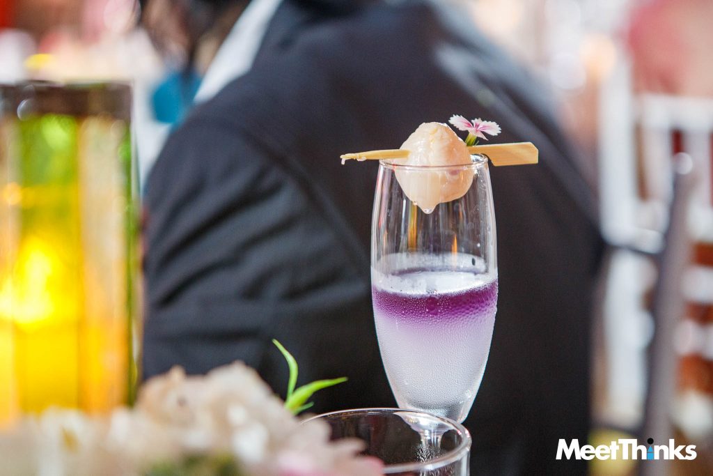 น้ำลิ้นจี่สีใสเปรียบเสมือนผืนแผ่นดินไทย น้ำอัญชันที่ค่อยๆไหลลงไปผสมกับสีของน้ำลิ้นจี่ เปรียบเสมือนการถูกล่าอาณานิคมจากอังกฤษและฝรั่งเศส ที่คุกคามสยามอยู่ตลอดแรงบันดาลใจนี้ถูกถ่ายทอดออกมาเป็นเมนู Welcome Drink “น้ำลิ้นจี่บัตเตอร์ฟลาย 3 รส” ในรูปแบบม็อกเทล มีทั้งความเปรี้ยว หวาน และเค็ม รสชาติที่สดชื่น เพื่อปลุกประสาทสัมผัสให้พร้อมก่อนการเดินทางสู่ประสบการณ์ของเมนูถัดไป