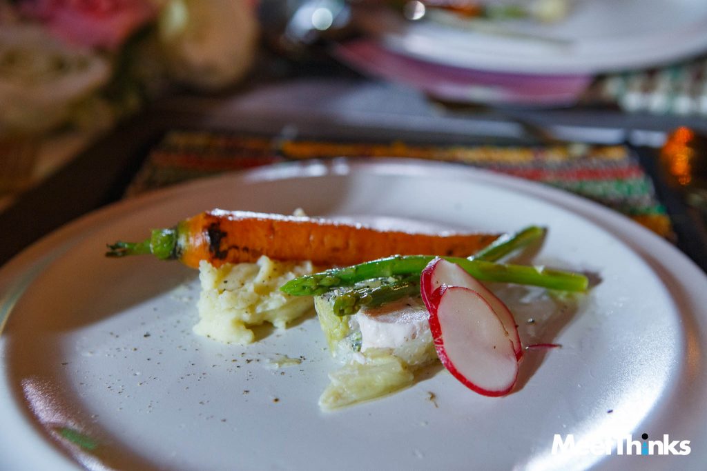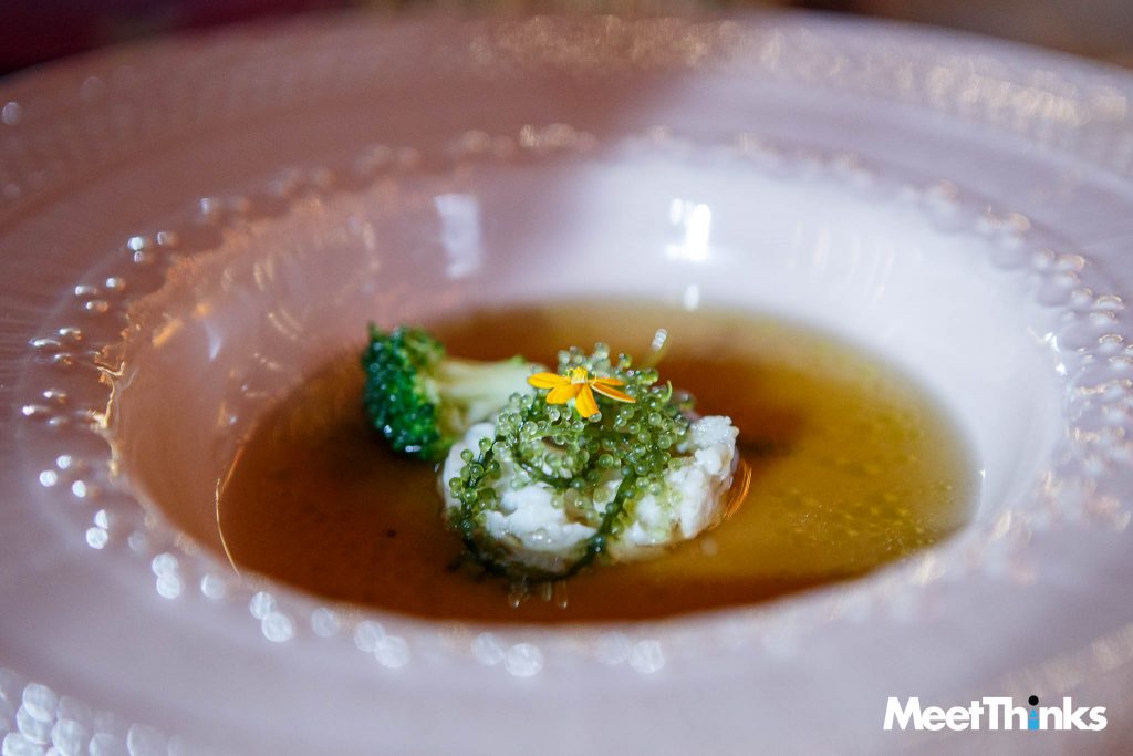 แรงบันดาลในการใช้ผัก 16ชนิดมาทำเป็นน้ำซุปทานคู่กับเนื้อปลาไทย ปรุงรสด้วยน้ำมะกรูด น้ำมะม่วงเบา สาหร่ายพวงองุ่นของจ.เพชรบุรี ผสมผสานความเป็นไทยและตะวันตกเข้าด้วยกันได้อย่างลงตัว อันเป็นสัญลักษณ์ตัวแทนของ 16ชาติที่รัชกาลที่ 5 ได้แต่งตั้งราชทูตและกงสุลประจำในต่างประเทศ
