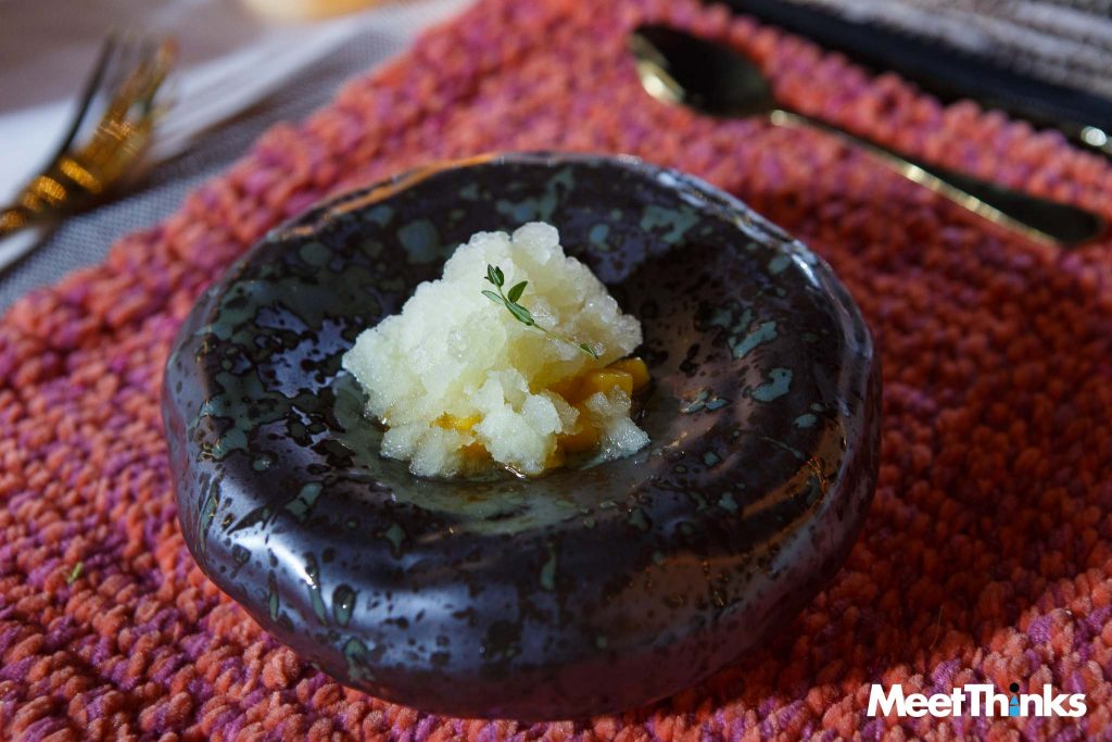 ซุปเย็นสไตล์สเปนที่นำมาดัดแปลงให้มีความทันสมัยสไตล์ญี่ปุ่น โดยการผสมผสานความหวานหอมของลูกพีชสุกเข้ากับความเปรี้ยวที่มีเอกลักษณ์ของส้มยูซุ เหมาะสำหรับเป็นอาหารเรียกน้ำย่อยที่ช่วยสร้างความสดชื่น เมนูนี้ถูกออกแบบมาเพื่อช่วยเคลียร์รสชาติปลุกประสาทสัมผัสก่อนพาผู้รับประทานเข้าสู่ประสบการณ์ของเมนู Main Course