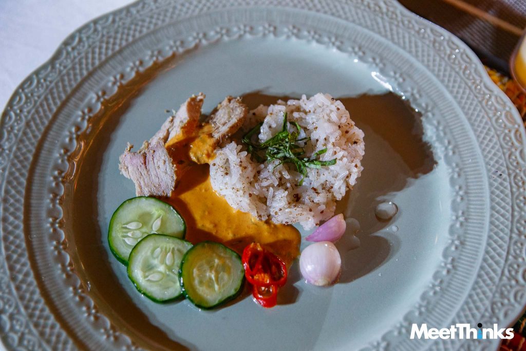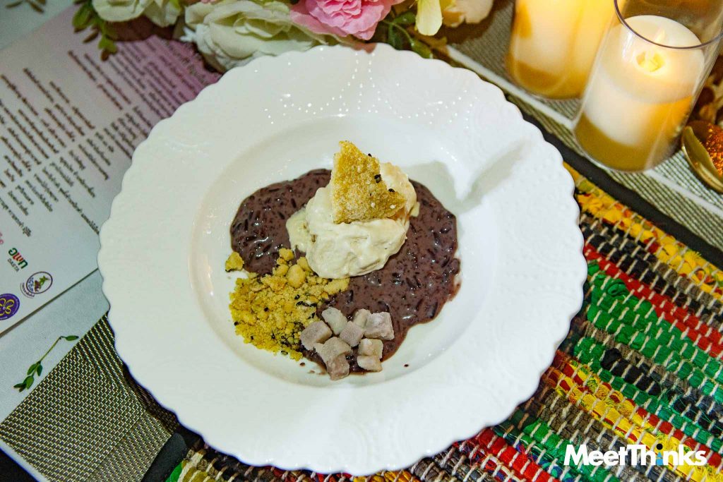 และพุดดิ้งจากข้าวเหนียวดำ รังสรรค์ให้เป็นของหวานร่วมสมัย เสริมด้วยผลไม้ของเมืองเพชรบุรี