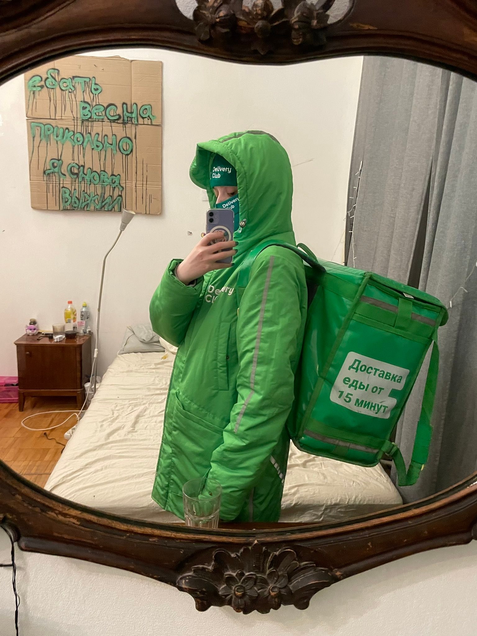 ด้าน Lucy Shtein คู่รัก และเพื่อนร่วมวง Pussy Riot โพสต์ภาพ MASHA บนทวิตเตอร์ แต่งเครื่องแบบสีเขียวของ Delivery Club และแบกเป้ส่งอาหาร