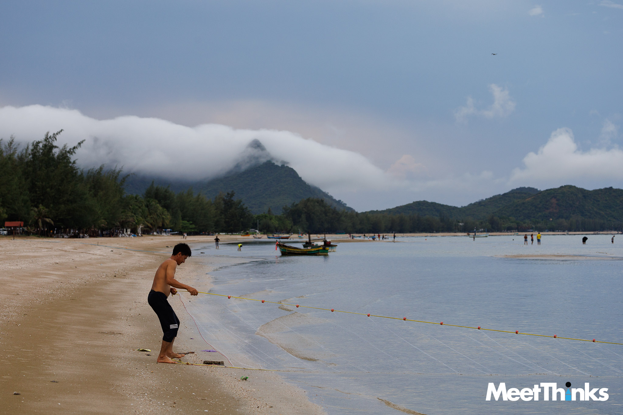 กลับจากคาเฟ่ชายคลอง มารวมตัวกันตรงชายหาดสามร้อยยอดอีกครั้ง วันนี้หน้ารีสอร์ทมีความคึกคัก เพราะน้ำลงกำลังเหมาะกับการวางอวน เราเจอกับนักท่องเที่ยวกลุ่มครอบครัวจากนครปฐม พวกเขาบอกว่ามาพักที่สามร้อยยอดบีชรีสอร์ทต่อเนื่องนานถึง 30 ปี ตั้งแต่เรียนมัธยม จนแต่งงานมีลูกมีหลานก็ยังพากันมาที่นี่