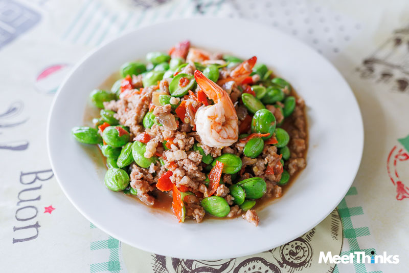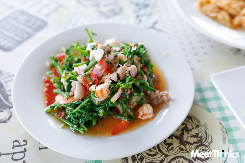 หน้าฝนเป็นช่วงที่สะตอเทพสถิตกำลังออกช่อเต็มต้น จึงมีเมนูผัดสะตอเป็นไฮไลต์ของทางร้าน ตามมาด้วยเมนูปลาต่าง ๆ รวมทั้งยำผักกูด และขาดไม่ได้กับ “ส้มตำ” ที่สั่งมาแซ่บกันแทบทุกมื้อ