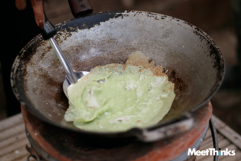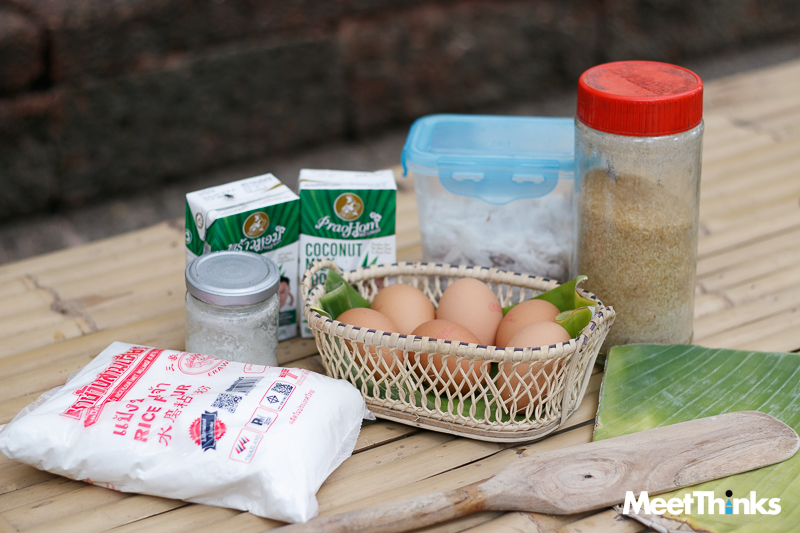 รวมทั้งการใส่เนื้อมะพร้าวอ่อนลงไป เพิ่มความหนุบหนับให้กับเนื้อแป้ง นำไปละเลงบนกระทะร้อน ๆ เมื่อสุกก็พับเป็นสามเหลี่ยม นำใส่กระทงใบตอง อร่อยได้ง่าย ๆ แถมยังเป็นกิจกรรมที่เปิดโอกาสให้ผู้มาเยือนได้ร่วมประลองฝีมือกันด้วย