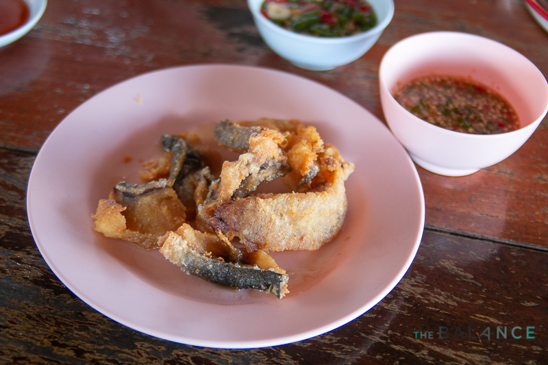 อาหารเช้าที่เรียงราย เคลื่อนจมูกผ่านไปก็โชยกลิ่นหอมฉุย แต่เป้าหมายที่แท้จริงไม่ได้อยู่ที่ตลาดเช้า เพราะก้าวไปอีกประมาณ 300 เมตร ก็จะถึงลานชมวิว “สะพานแขวนหลวงปู่สาย” ที่ยามเช้าบรรดาพระสงฆ์จากวัดท่าขนุน จะเดินออกรับบิณฑบาตและผ่านบริเวณสะพานแห่งนี้